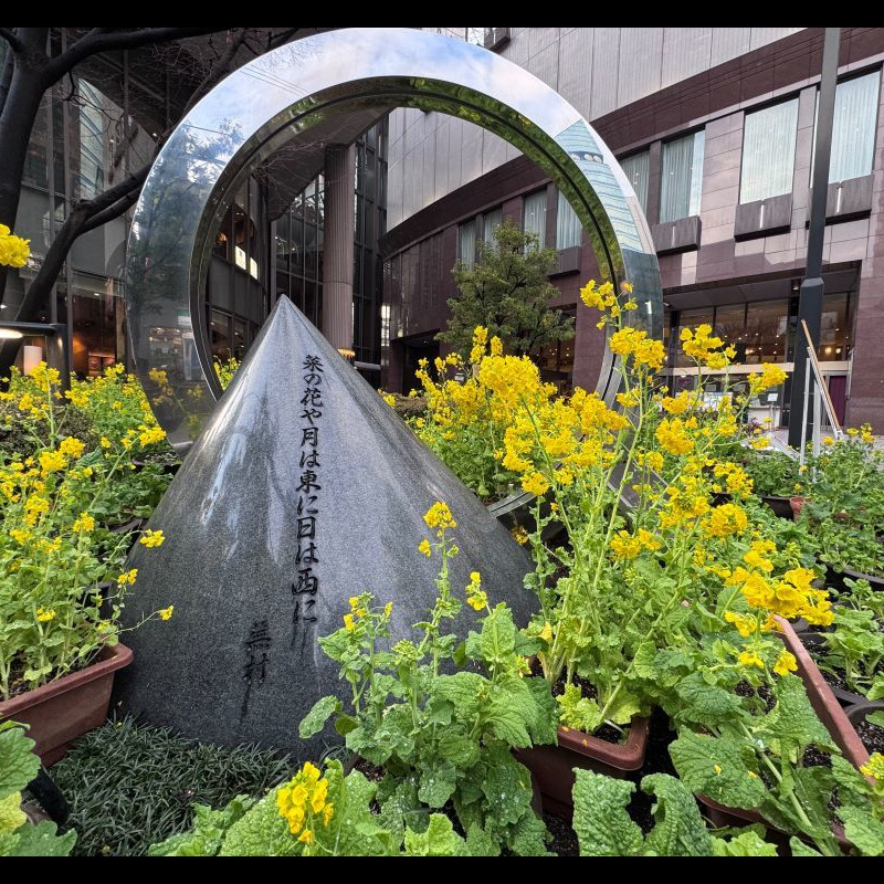 お持ち寄りいただいた菜の花は、句碑前一面をやさしい黄色で彩り、茶屋町に春を告げる風景となりました。